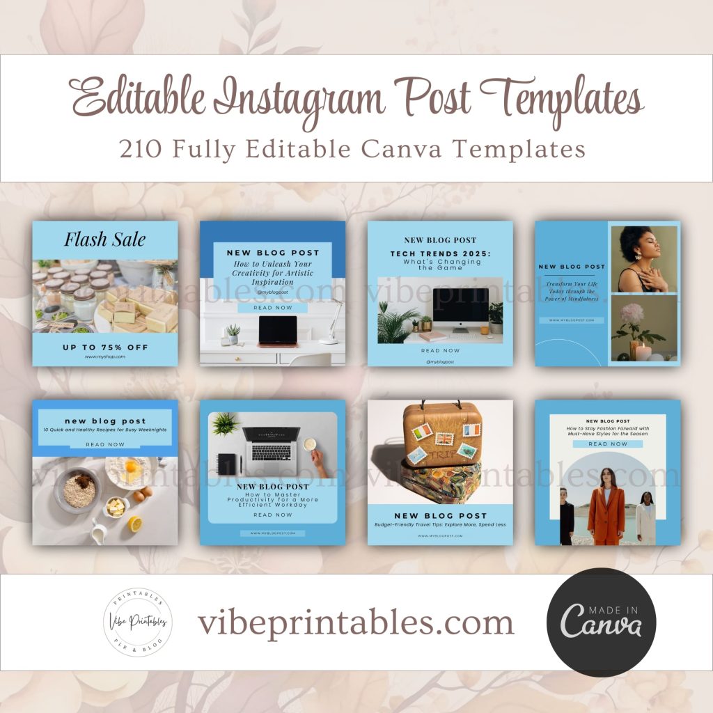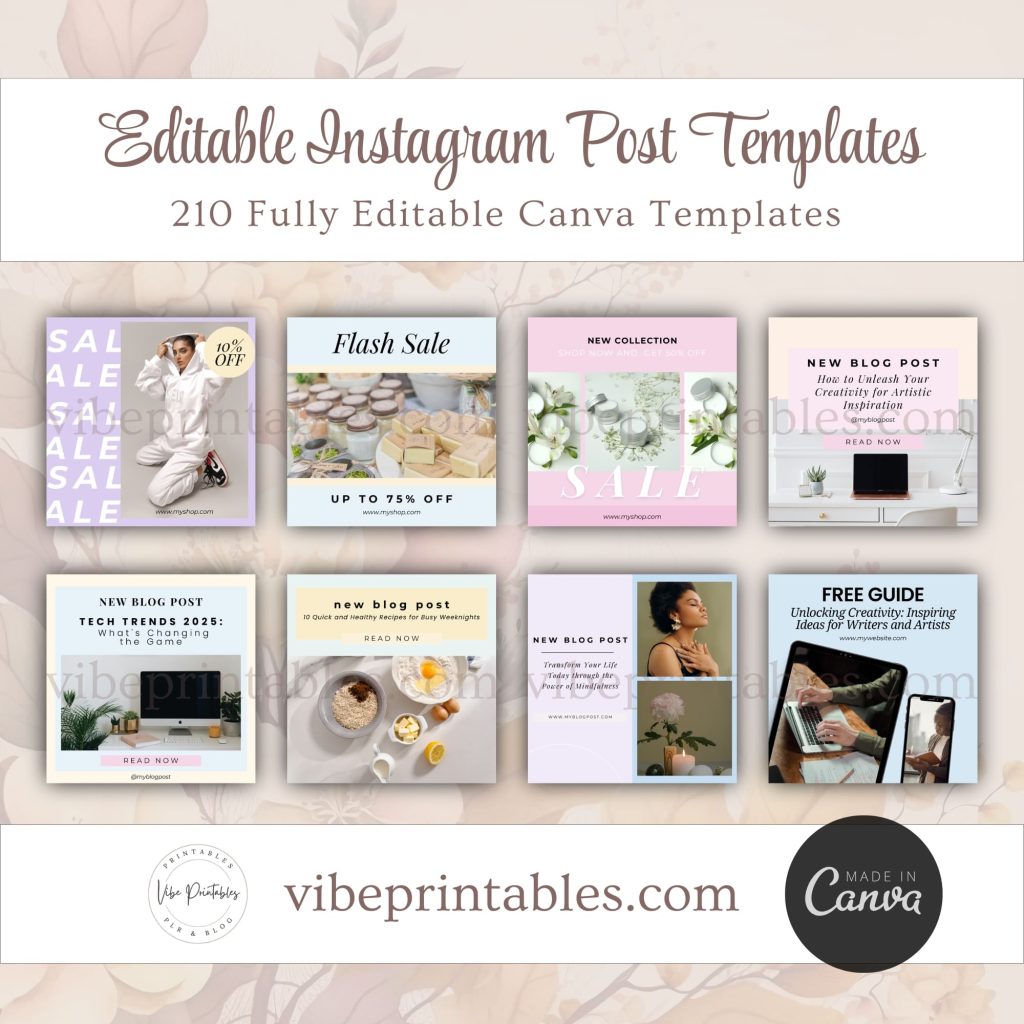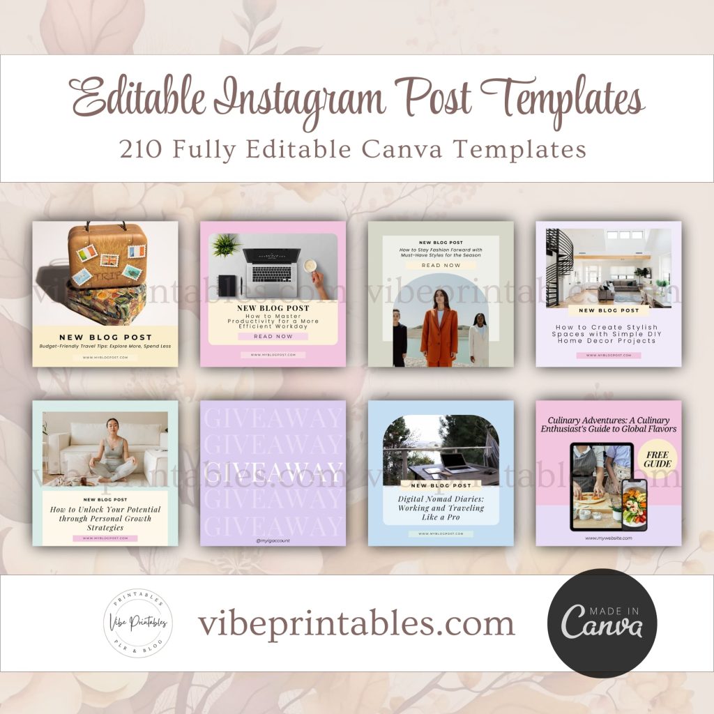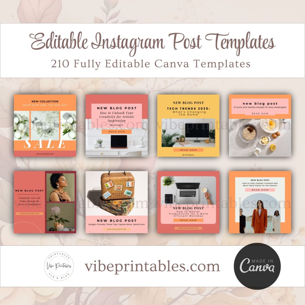 ✅ 210 Fully Editable Canva Templates so you can easily customize fonts, colors, and images.